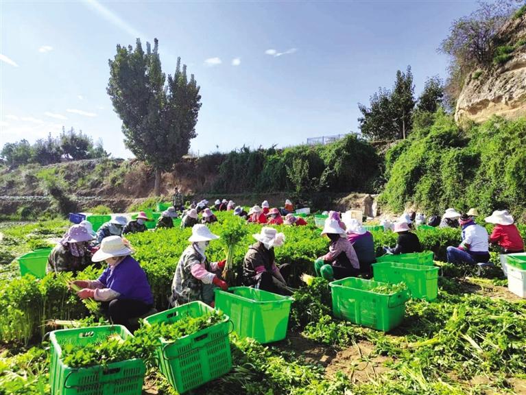 在榆中县金崖镇祥龙蔬菜产销专业合作社负责人豆俊兰的指挥下,村民们采摘、分拣、装车,蔬菜运往合作社保鲜库。经过清洗、削根、扎捆,装进保鲜库进行24小时降温。随后,这些蔬菜将运往广东、天津等地市场销售。现在,合作社每年蔬菜外销量达到1.5万余吨。