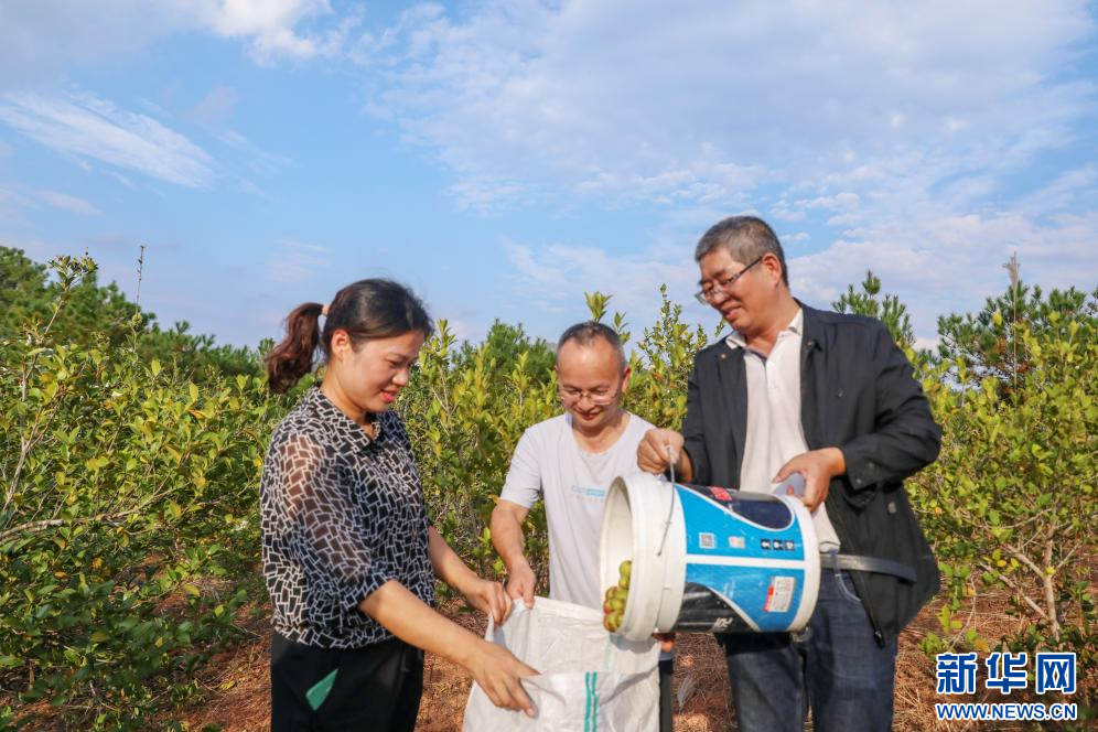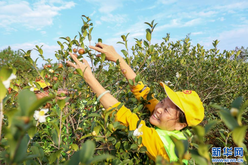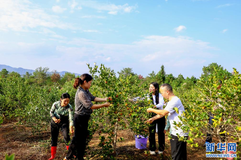 近日,在江西省抚州市乐安县增田镇带陂村油茶种植基地,该县政协委员和农户一起采摘油茶。新华网发 黄煜 摄