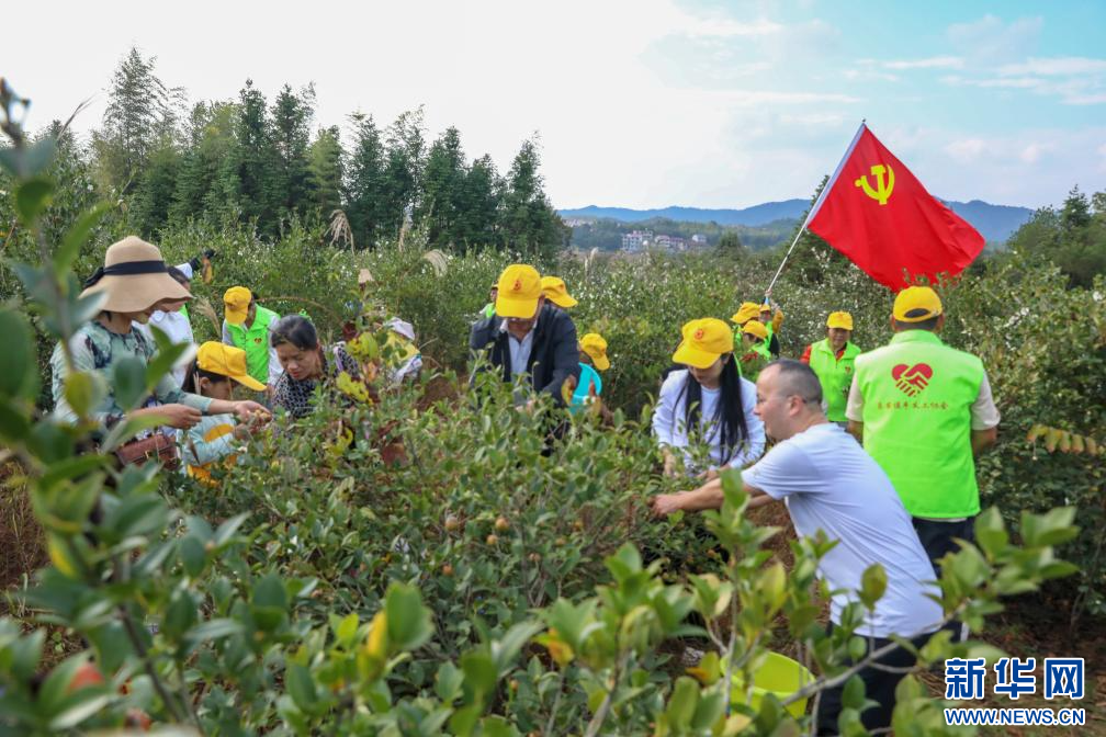 近日,在江西省抚州市乐安县增田镇带陂村油茶种植基地,该县政协委员组织志愿服务队,帮助农户采摘油茶。新华网发 黄煜 摄