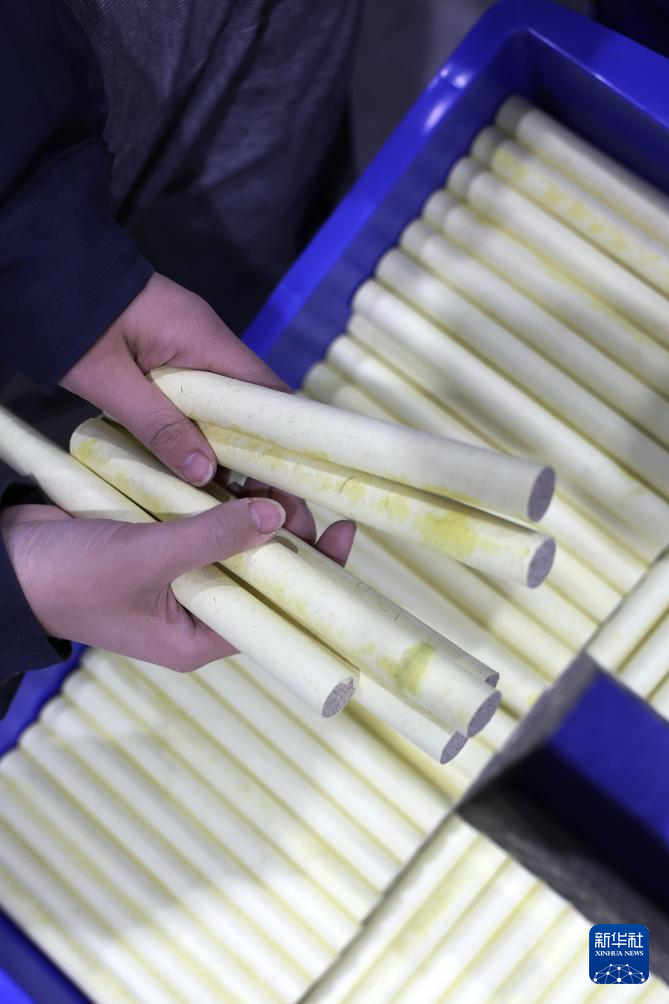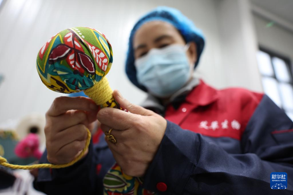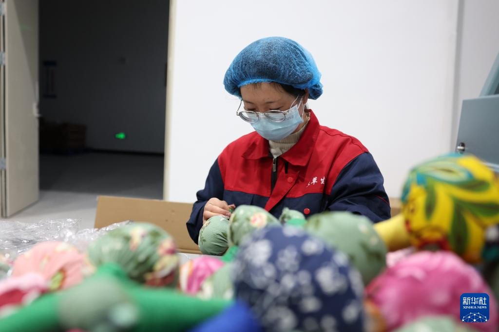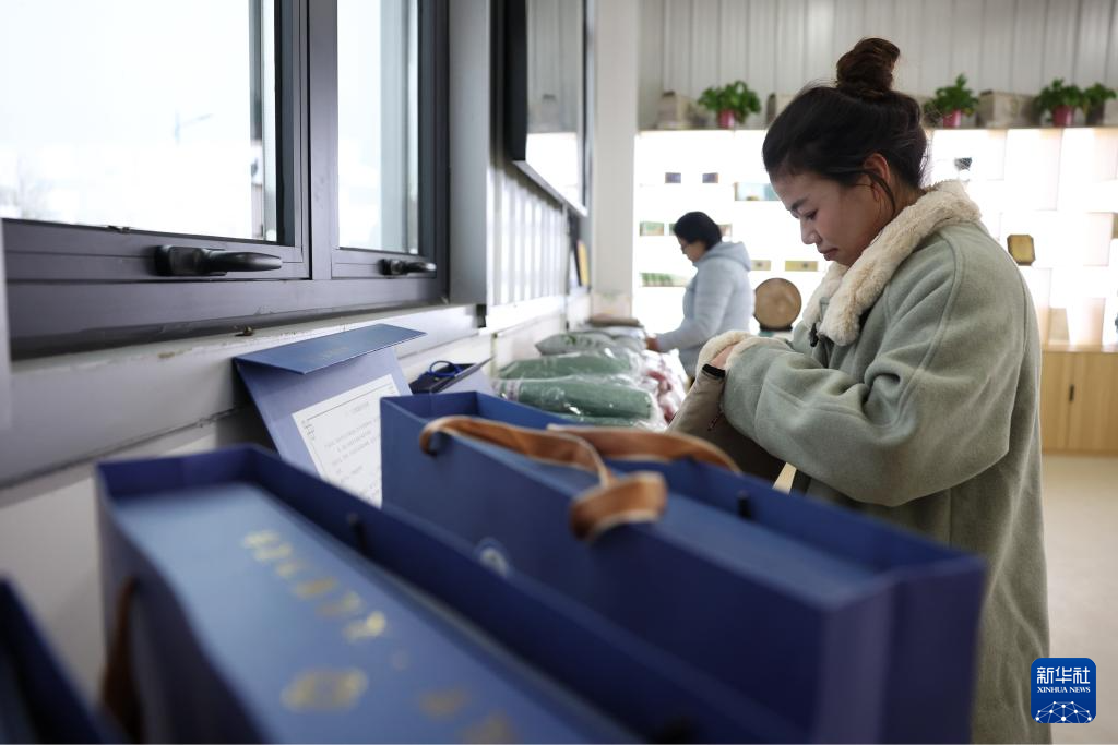 在灵台县独店镇张鳌坡村一家艾草生产加工企业,工人在展厅内整理产品(11月20日摄)。新华社记者 陈斌 摄