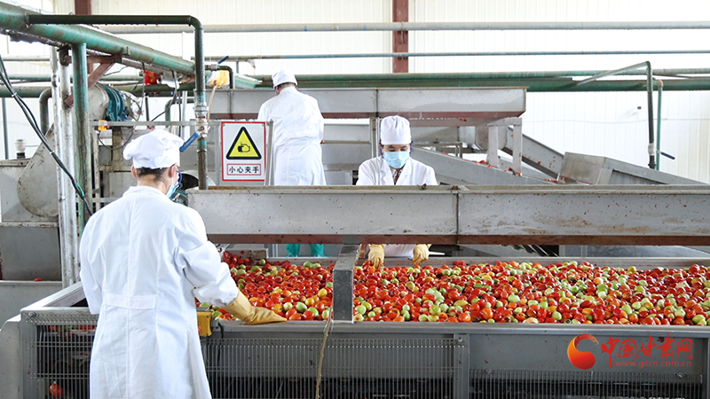 在甘肃新天昇生物科技有限责任公司生产车间里,自动化设备平稳运转,工人们正忙碌而有序地进行番茄酱加工生产。作为一家集种植、加工、贸易于一体的农业产业化企业,新天昇生物科技今年通过自建基地和与种植大户合作,建立起专属原料供应链,在保障原料品质的同时,有效带动周边农户增收。
