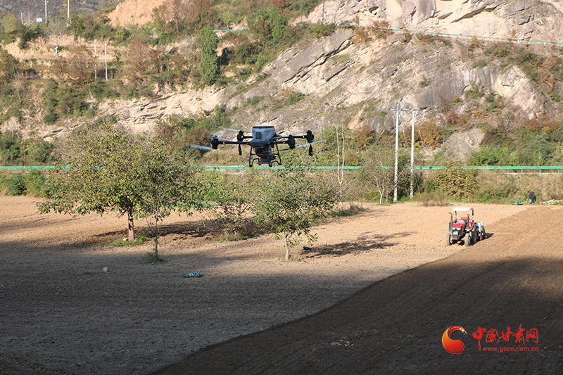 在成县镡河乡将利村,百亩连片的小麦预留地块里,大型拖拉机翻土、播种、覆埋一气呵成,伴随着机械轰鸣声,一粒粒饱满的麦种精准落入墒情充足的土壤;无人机在头顶盘旋,将肥料均匀播撒在田间。
