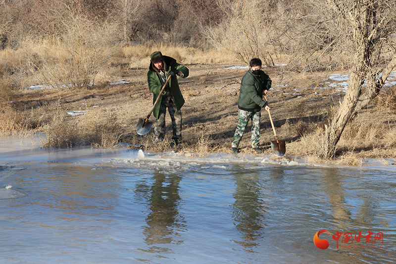 在张掖市五泉林场第三管护站灌溉现场,护林员们紧随水流,密切关注水头和闸口,根据水流速度和渗水深度,适时调整水量,确保林区每一棵树木都得到充分的冬水滋养。