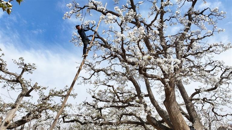 “古梨园地势不平、梨树错落、空间狭窄,升降机等机械无法开进来,因此‘天把式’沿用至今,仍然发挥着巨大的作用。”魏周玉自豪地说,除此之外,像“掸花震虫”“刮树皮”等传统技法,完全依靠物理手段防治病虫害,不施用任何化学农药。这种方法不仅保护了梨园的生态环境和土壤健康,更让结出的果实品相自然、口感格外爽脆。