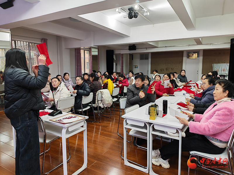 培训现场,学员们围桌而坐,凝神聚力、潜心钻研。红纸在手中翻折翻转,剪刀在指尖开合自如,伴随着清脆的“咔嚓”声,一张张普通的红纸几经雕琢,便化作福字纳祥、花鸟争艳、生肖贺岁的精美剪纸作品。灵动的图案、精巧的剪裁,不仅展现出非遗技艺的独特魅力,更承载着大家对美好生活的真挚期许。