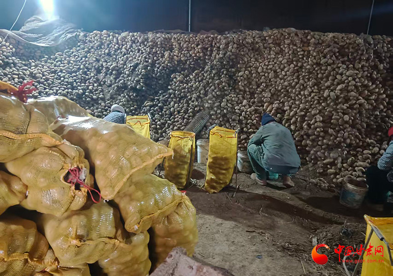 同时,在界石铺镇高堡村荣塬农业合作社仓库,洋芋分拣、装袋等出售工作也在紧张进行。合作社负责人王鹏现场查看工人装袋,电话联系客商,忙得不可开交。
